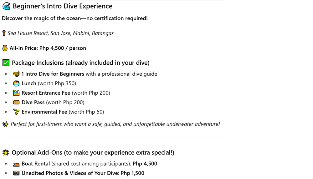 Php 4,500  per person including gear, 2 to 3 hours, one on one with our dive pro, one dive on the open water.